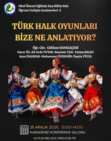 25 Aralık 2025 tarihli “Türk Halk Oyunları Bize Ne Anlatıyor” isimli etkinlikte Öğr. Gör. Gökhan HAMZAÇEBİ, oyun ve dansın sosyolojik anlamı üzerinde durarak nefes ve beden bütünlüğü içerisinde dansın tanımı ile kültürel kimlik aktarımı üzerinde bilgiler sundu. Toplumsal kültür becerilerine sahip, Türk topluluklarının kültürel davranışlarının, kurdukları devlet teşkilatlarının da temelini oluşturduğundan bahseden HAMZAÇEBİ, kültürel yolculuk içerisinde halk oyunları ve folklorik pratiklerin toplum davranışlarının bir durağı olduğuna dikkat çekti. Ayrıca bu pratikler içerisinde halk oyunlarının; düğün, geleneksel bayram ve toplu eğlenceler gibi ritüellerde, bedensel hareketin düzenleyicisi olarak merkezi bir rol üstlendiğine de değindi.
