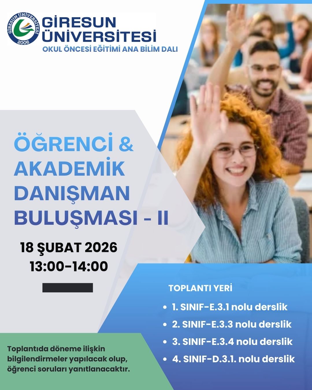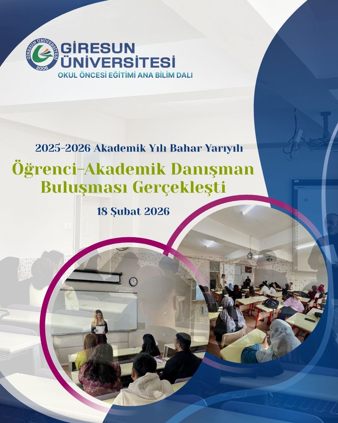 Fakültemiz Temel Eğitim Bölümü Okul Öncesi Eğitimi Ana Bilim Dalı tarafından, 2025-2026 akademik yılında programa devam eden 2., 3. ve 4. sınıf öğrencilerine yönelik öğrenci-akademik danışmanlık buluşması gerçekleştirildi.