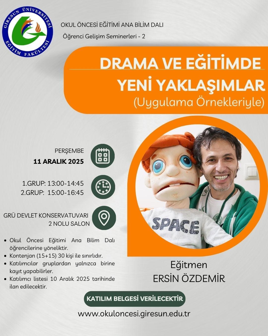 11 Aralık 2025 tarihinde Devlet Konservatuvarı uygulama salonundaki “Drama ve Eğitimde Yeni Yaklaşımlar (Uygulama Örnekleriyle) başlıklı etkinlikte tiyatro oyuncusu Ersin Özdemir eğitmen olarak yer aldı.