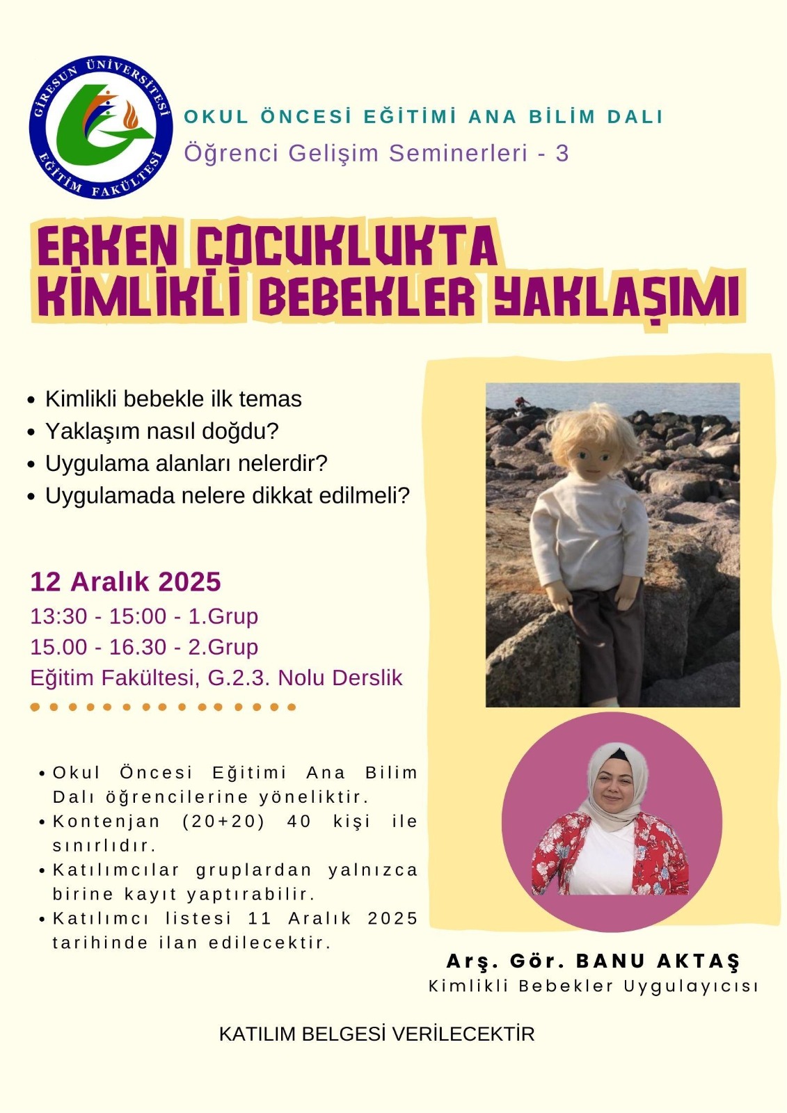 12 Aralık 2025 tarihinde Fakültemizin G.2.3 nolu dersliğinde Kimlikli Bebekler Yaklaşımı Uygulayıcısı Arş. Gör. Banu AKTAŞ tarafından “Erken Çocuklukta Kimlikli Bebekler Yaklaşımı” etkinliği gerçekleştirilmiştir.