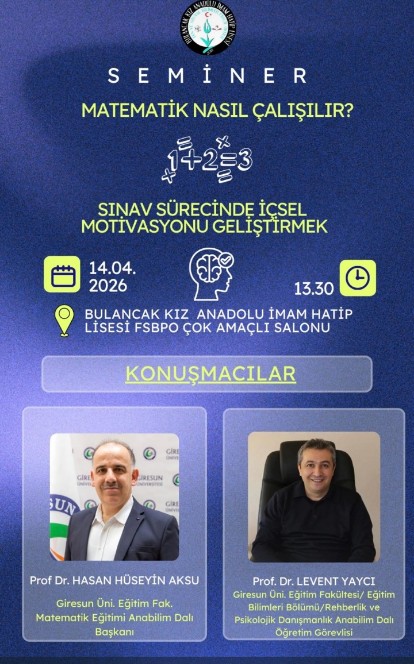 Fakültemiz Matematik Eğitimi Ana Bilim Dalı öğretim üyesi ve aynı zamanda Dekan Yardımcımız Prof.Dr. Hasan Hüseyin AKSU ve Eğitim Bilimleri Bölümü öğretim üyelerinden Doç.Dr. Levent YAYCI, Bulancak İmam-Hatip Ortaokulunda 14 Nisan 2026 Salı günü düzenlenen seminerlere konuşmacı olarak katıldı. Prof.Dr. Hasan Hüseyin AKSU 'Matematik Nasıl Çalışılır?' ve Doç.Dr. Levent YAYCI 'Sınav Sürecinde İçsel Motivasyonu Geliştirmek' konulu seminlerler gerçkeleştirdiler.