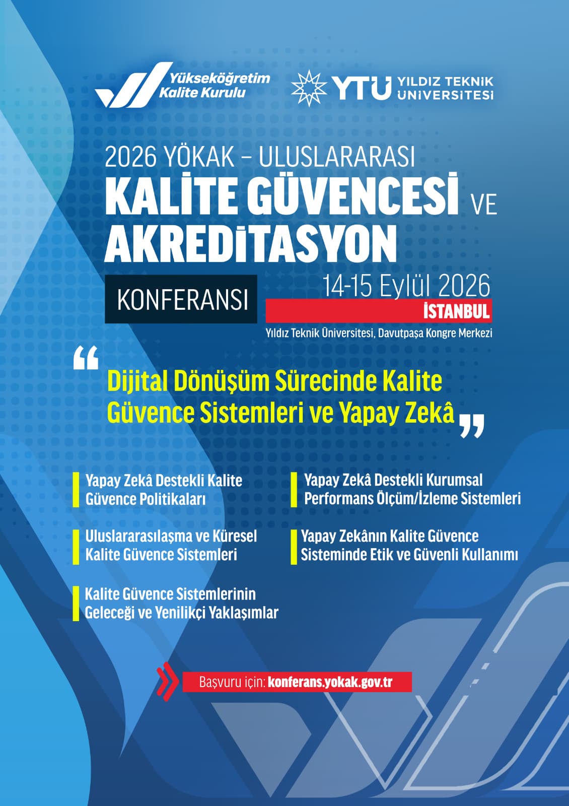 Yükseköğretim Kurulu Başkanlığı tarafından, ulusal ve uluslararası düzeyde yoğun ilgi gören 2024 YÖKAK Uluslararası Kalite Güvencesi ve Akreditasyon Konferansı'nın ikincisi olarak, Yıldız Teknik Üniversitesi ev sahipliğinde 14–15 Eylül 2026 tarihlerinde İstanbul'da "Dijital Dönüşüm Sürecinde Kalite Güvence Sistemleri ve Yapay Zekâ" temasıyla 2026 YÖKAK Uluslararası Kalite Güvencesi ve Akreditasyon Konferansı düzenlenecektir.